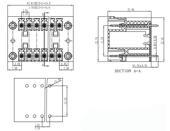 材質(zhì)及電鍍 螺母:M2.5,黃銅 焊針:黃銅,鍍錫 塑件:PA66,UL94V-0 電氣性能 參考標(biāo)準(zhǔn): UL IEC 額定電壓:300V 250V 額定電流:8A 10A 接觸電阻:20mΩ 絕緣電阻:5000MΩ/DC1000V 耐電壓:AC 2000V/1 Min 機(jī)械性能 溫度范圍:-40℃~+105℃ 瞬時(shí)溫度:+250℃ 5秒