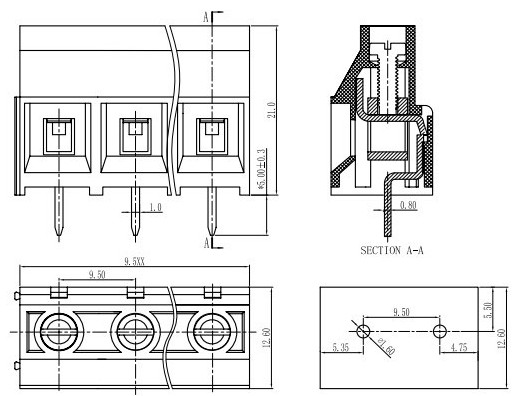 材質(zhì)螺絲:M3鋼 鍍鋅觸頭:黃銅焊針:黃銅 鍍錫塑件: PA66, UL94V-0