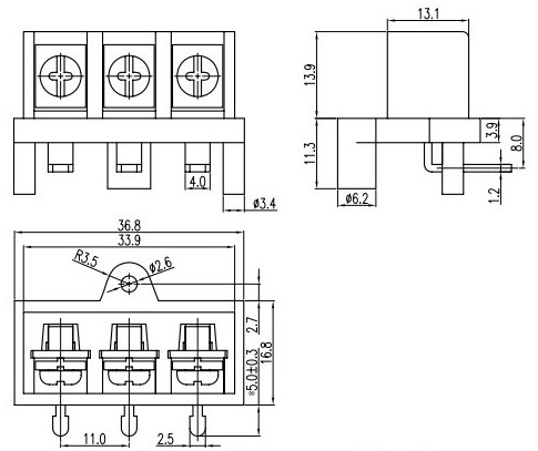 材質(zhì)塑件:PBT, UL94V-0端子:黃銅1.2t,鍍錫螺絲:M4 鋼 鍍鎳
